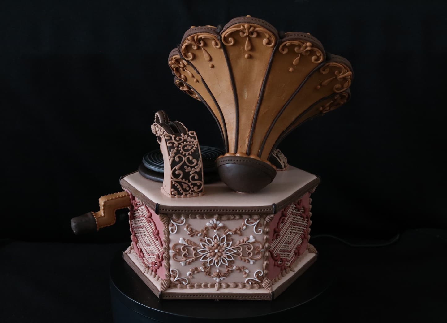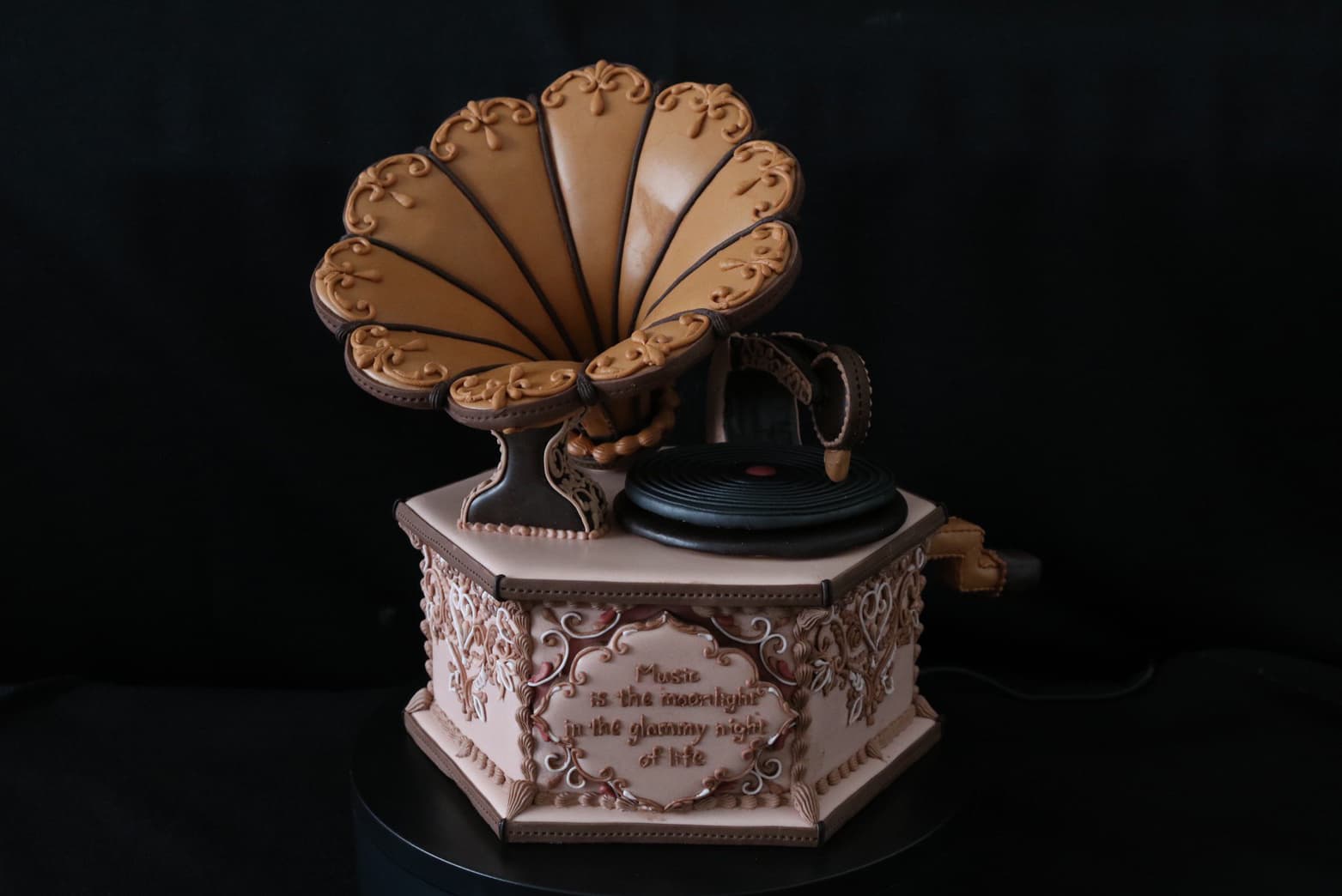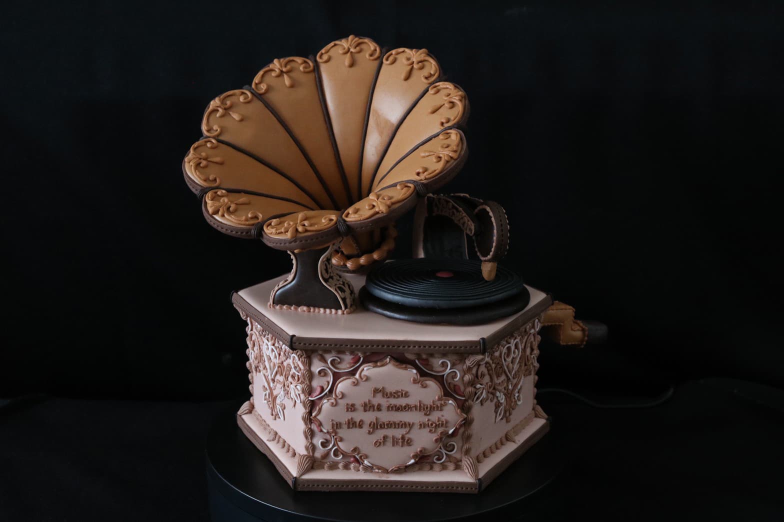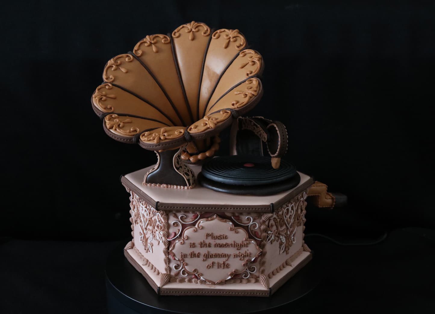 この作品に込めた思いは、この一年半でコロナにより世界中が困難に見舞われ、沢山の方々が亡くなり、生活が一変したと思います。そんな中、音楽は人々に癒しと安らぎを与え、言葉の壁を越えてコミュニケーションのとれる世界共通の文化だと思います。その音楽を沢山の方々に届くよう、蓄音機に込めて作成しました。