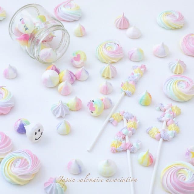 Lesson1『基本のメレンゲクッキー&メレンゲトッパー™』 基本のメレンゲクッキーの作り方・表面の着色方法・生地の着色方法・味のつけ方・生地の絞り方・ケーキトッパーの作り方・裏面の模様のつけ方など、メレンゲクッキーの基本からアレンジ方法までをしっかりと学びます。 |