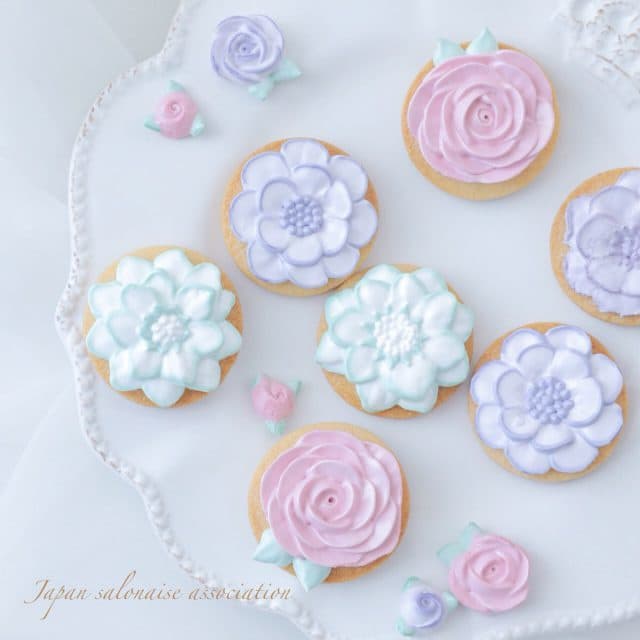 Lesson4『メレンゲフラワー™ クッキー』 お花絞りに適したメレンゲ生地で、スカビオサ・ダリア・ローズ・リボンローズ・リーフを絞り、メレンゲフラワー™クッキー作りを学びます。 |