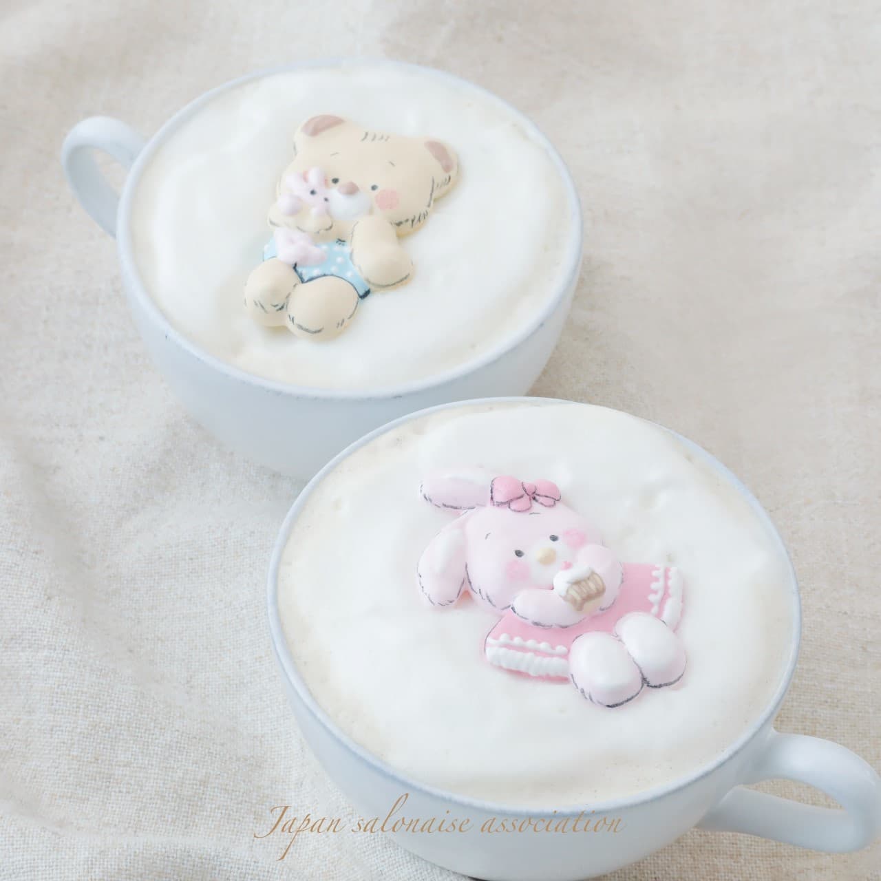 Lesson5『ドリンクメレンゲトッパー™』 2Ⅾに適した生地の作り方・立体的なメレンゲトッパー™の作り方・ペインティングを学び、かわいいうさぎとクマのドリンクメレンゲトッパーを学びます。ラテアートに負けない可愛らしさは、おもてなしにぴったりです。カフェラテや紅茶・ホットココア・ホットミルクに浮かべて楽しんでくださいね。 |